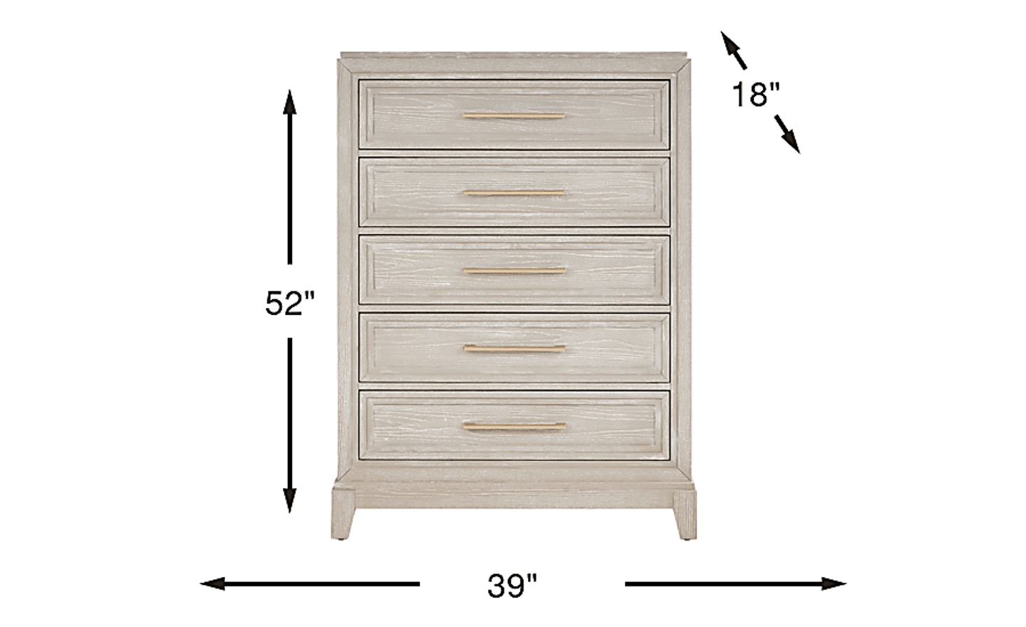With textures and contours accompanying a stately air and commanding presence, the Sunside Way chest is a perfect complementary piece in a bedchamber befitting the most eminent of royalty. Finished in a beautiful sand color, this contemporary piece features five drawers with French dovetail joints front & back, levelers, dustproof bottoms, and full extension ball bearing glides for easy access and exceptional durability.