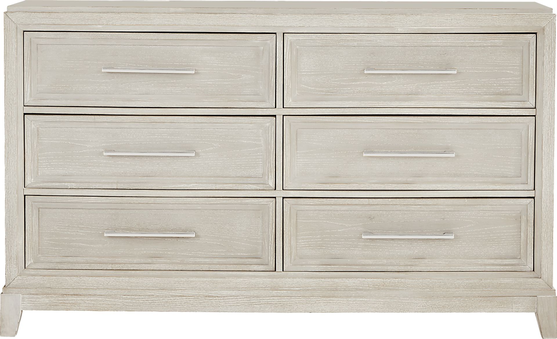 Brimming with luminous contemporary charm, the Sunside Way dresser offers glorious style for your space. Showcasing a sand-colored finish, this six drawer dresser is configured with French dovetail fronts and backs with ball bearing full extension glides. Each of the drawers has a metal bar pull finished in gleaming chrome for the perfect final touch.