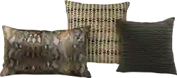 The Suryhne pillow set features earthy tones. The grey shades give depth adding personality & cohesiveness with multi-colored chenille jacquard, wavy pleated velvet, & metallic snakeskin print on velvet. Customer assembly required.