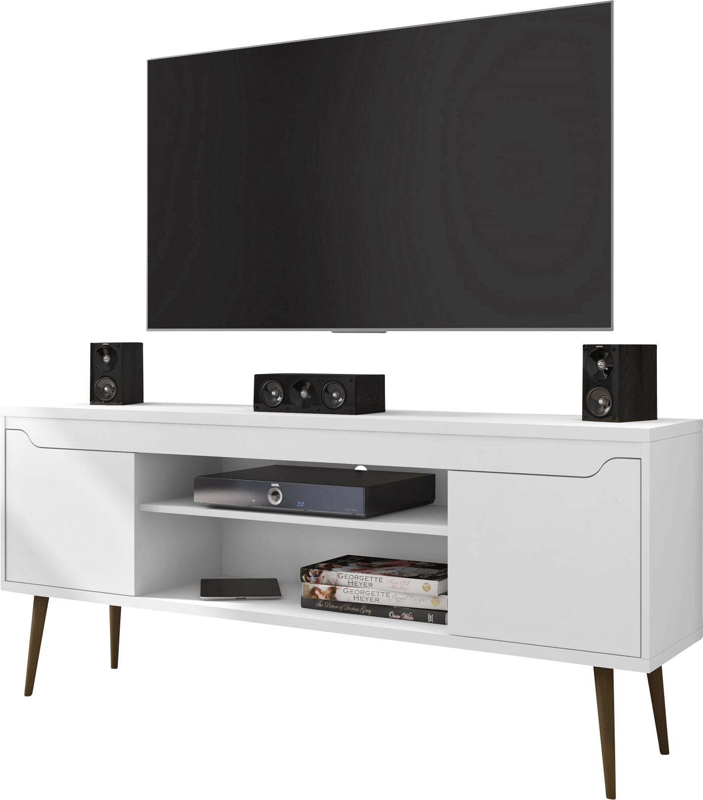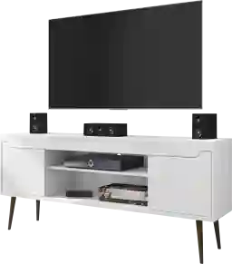 This unit features a strategic mix of open and closed storage to maximize functionality. It includes open shelving, which is ideal for devices that require airflow or easy remote access like DVD players and soundbars. Additionally, two storage cubbies are concealed behind slab-style doors, providing a discrete space to tuck away clutter, books, or gaming controllers.