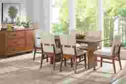Exquisitely detailed, the elegant charm of the Surrey Ellis dining room is underlined by an exacting attention to even the smallest elements that make it unique. The bold lines of the rectangular double pedestal table in this set are balanced by chairs with signature midcentury modern tapering on their poised legs and back posts, all finished in brown mango veneers. Each chair features an upholstered seat and back cushion in beige.