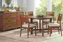 Exquisitely detailed, the elegant charm of the Surrey Ellis dining room is underlined by an exacting attention to even the smallest elements that make it unique. The bold lines of the round trestle table in this set are balanced by chairs with signature midcentury modern tapering on their poised legs and back posts, all finished in brown mango veneers. Each chair features a plank seat back that echoes the shapes of the table and an upholstered seat in beige.