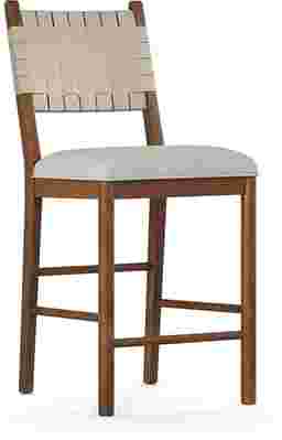 Exquisitely detailed, the elegant charm of the counter height Surrey Ellis stool is underlined by an exacting attention to even the smallest elements that make it unique. The bold lines of this piece include signature midcentury modern tapering on poised legs and back posts, all finished in brown mango veneers. A strap back in soft beige fabric and a matching upholstered seat cushion adds quiet sophistication and tailored refinement.
