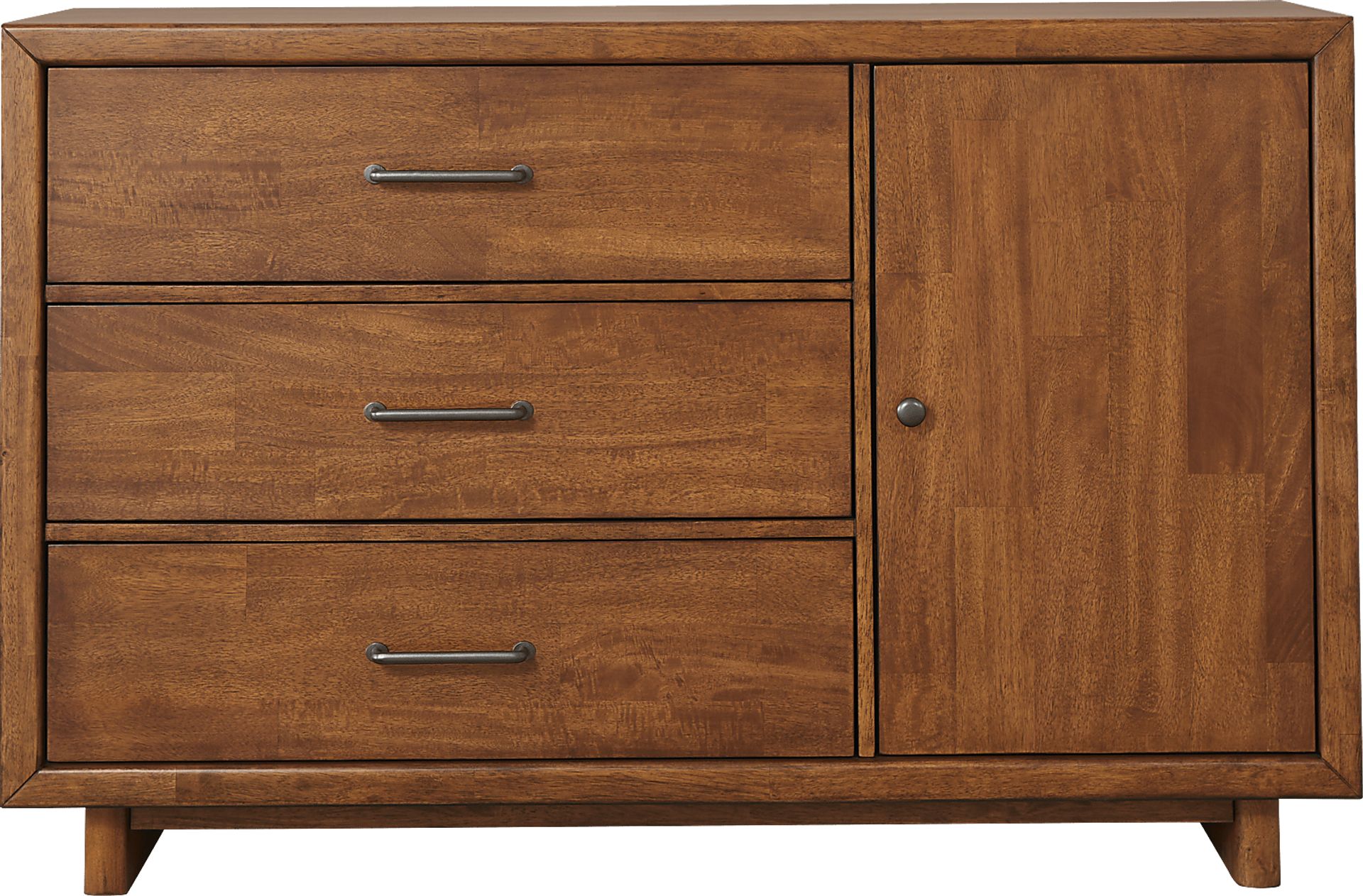 Exquisitely detailed, the elegant charm of the Surrey Ellis server is underlined by an exacting attention to even the smallest elements that make it unique. The bold lines of this piece are balanced by gently rounded edges, all finished with mango wood veneers in brown. Three drawers feature metal pulls in black, while a cabinet with three shelves opens with a matching knob. Four canted legs put the defining touch on this accent.