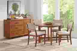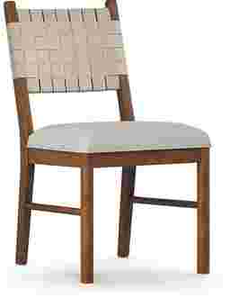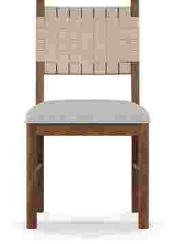 Exquisitely detailed, the elegant charm of the Surrey Ellis dining chair is underlined by an exacting attention to even the smallest elements that make it unique. The bold lines of this piece include signature midcentury modern tapering on poised legs and back posts, all finished in brown mango veneers. A strap back in soft beige fabric and a matching upholstered seat cushion adds quiet sophistication and tailored refinement.