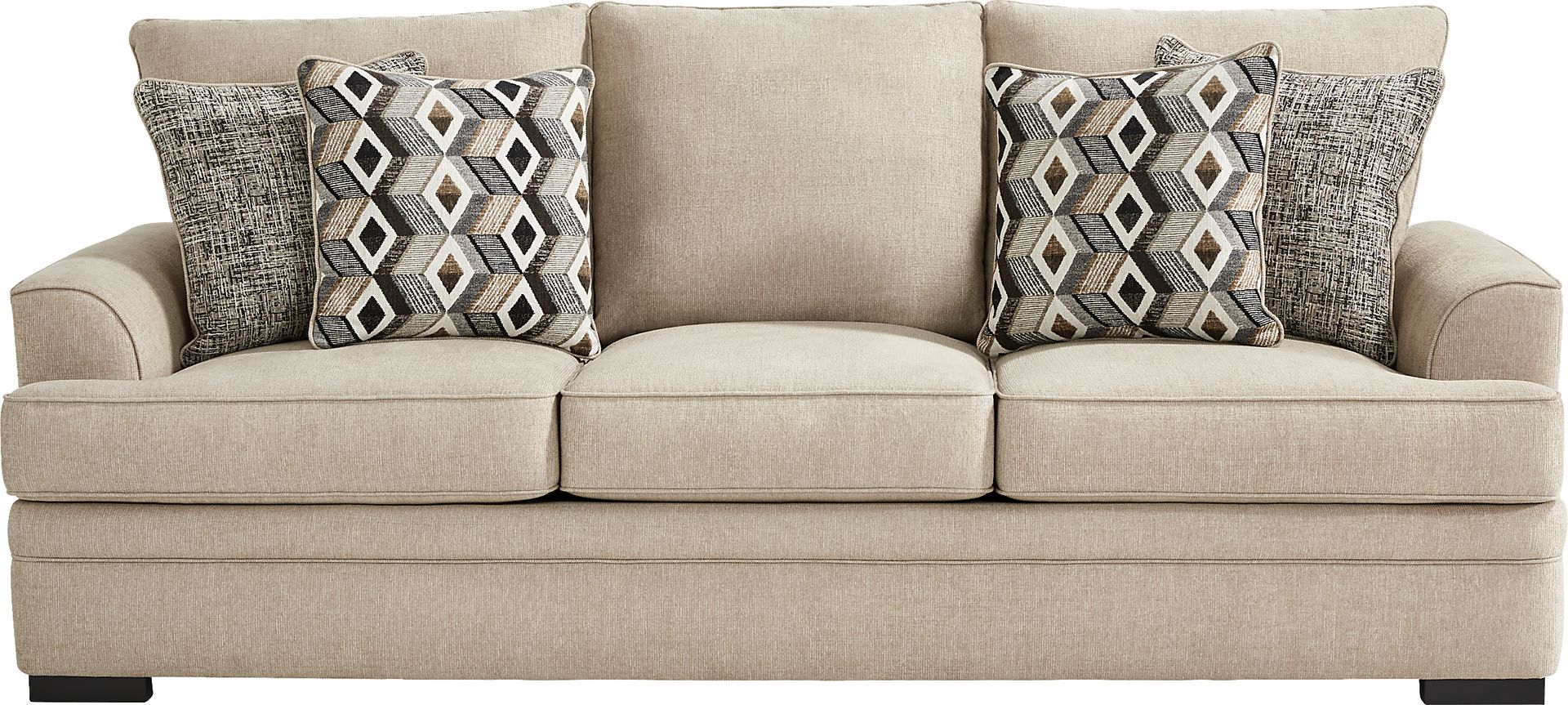 The Surrey Hills Beige Sofa features a minimalistic and transitional design, characterized by its stylish wedge arms, comfortable pillow back, and low profile legs. Upholstered in a relaxing beige woven fabric, it offers a versatile foundation for your living room. To style it, you can introduce contrasting textures with throw pillows and blankets, anchor the space with an area rug, and complement its neutral tone with accent furniture and decor in natural wood or metallic finishes.