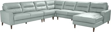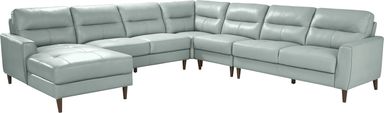 Based on our furniture care expertise, we recommend dusting the leather regularly with a soft, dry cloth to prevent grit from settling into the grain. For minor spills, gently blot the area with a cloth dampened with warm water and a very mild soap. To protect the integrity of the top grain leather and the vibrant aqua color, it is best to position the sectional away from direct sunlight and heat sources, which can cause leather to dry or fade over time.