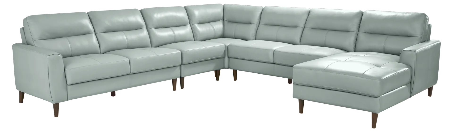 You can search high and low for a living room style as striking as the Sutton Heights sectional, but you'd be depriving yourself of the fantastic amenities in this beautiful piece. Upholstered in top grain leather where the body touches, the right arm facing chaise and left arm facing loveseat offer premium comfort with sumptuously padded seats and tufted cushions. Flare arms hug each end of the sectional with welted seams while top-stitched seams on the seats and backs highlight the piece's elegance. Flush with rich modern appeal, the upholstery's aqua color is offset by tapered legs in dark brown finish. Upholstery: Top grain leather where the body touches and polyurethane fabric sides and backs.