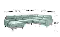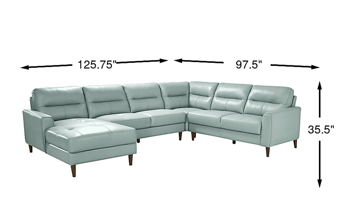 You can search high and low for a living room style as striking as the Sutton Heights sectional, but you'd be depriving yourself of the fantastic amenities in this beautiful piece. Upholstered in top grain leather where the body touches, this piece is flush with rich modern appeal. From the left arm facing chaise all the way to right arm facing loveseat, you'll love the premium comfort supplied by the sumptuously padded seats and tufted cushions. Flare arms hug each end of the sectional with welted seams while top-stitched seams on the seats and backs highlight the piece's elegance. The upholstery's aqua color is offset by tapered legs in dark brown finish. Upholstery: Top grain leather where the body touches and polyurethane fabric sides and backs.