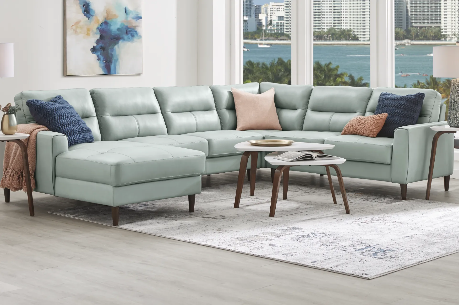 You can search high and low for a living room style as striking as the Sutton Heights sectional, but you'd be depriving yourself of the fantastic amenities in this beautiful piece. Upholstered in top grain leather where the body touches, this piece is flush with rich modern appeal. From the left arm facing chaise all the way to right arm facing loveseat, you'll love the premium comfort supplied by the sumptuously padded seats and tufted cushions. Flare arms hug each end of the sectional with welted seams while top-stitched seams on the seats and backs highlight the piece's elegance. The upholstery's aqua color is offset by tapered legs in dark brown finish. Upholstery: Top grain leather where the body touches and polyurethane fabric sides and backs.