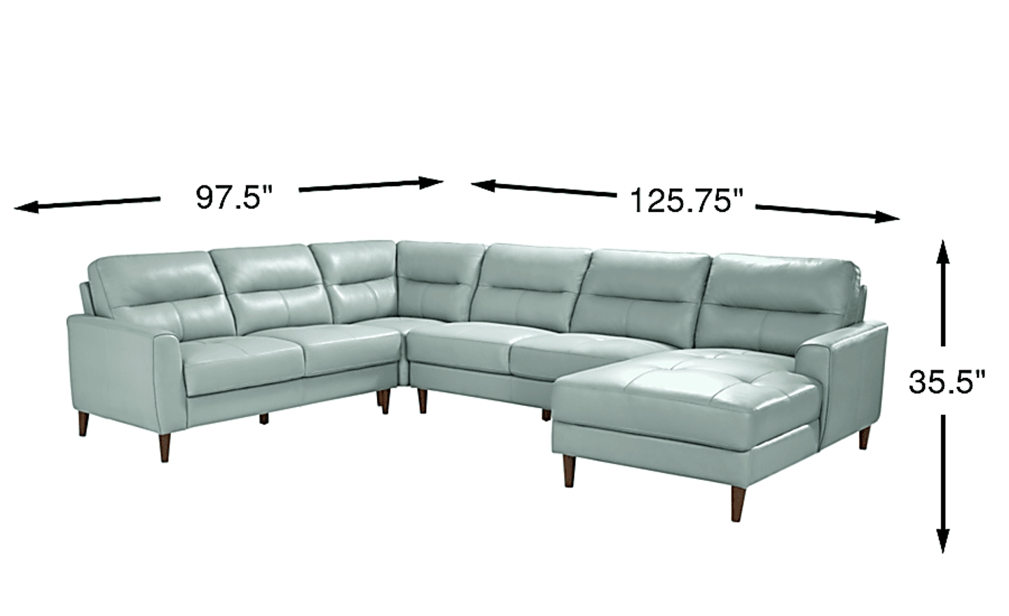 You can search high and low for a living room style as striking as the Sutton Heights sectional, but you'd be depriving yourself of the fantastic amenities in this beautiful piece. Upholstered in top grain leather where the body touches, this piece is flush with rich modern appeal. From the right arm facing chaise all the way to left arm facing loveseat, you'll love the premium comfort supplied by the sumptuously padded seats and tufted cushions. Flare arms hug each end of the sectional with welted seams while top-stitched seams on the seats and backs highlight the piece's elegance. The upholstery's aqua color is offset by tapered legs in dark brown finish. Upholstery: Top grain leather where the body touches and polyurethane fabric sides and backs.