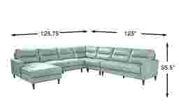 You can search high and low for a living room style as striking as the Sutton Heights sectional, but you'd be depriving yourself of the fantastic amenities in this beautiful piece. Upholstered in top grain leather where the body touches, this piece is flush with rich modern appeal. From the left arm facing chaise all the way to right arm facing loveseat, you'll love the premium comfort supplied by the sumptuously padded seats and tufted cushions. Flare arms hug each end of the sectional with welted seams while top-stitched seams on the seats and backs highlight the piece's elegance. The upholstery's aqua color is offset by tapered legs in dark brown finish. Upholstery: Top grain leather where the body touches and polyurethane fabric sides and backs.