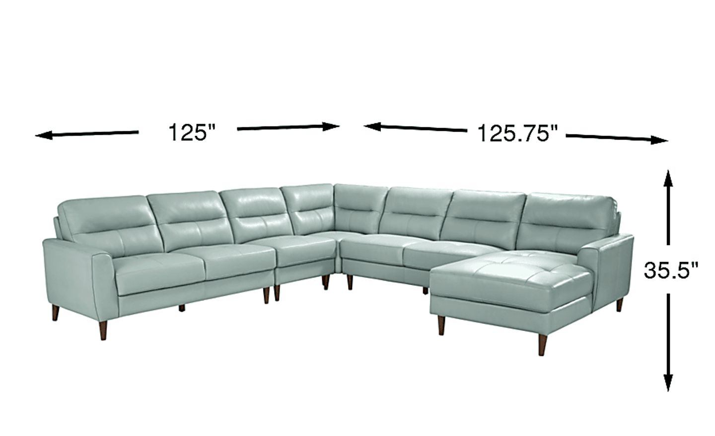 You can search high and low for a living room style as striking as the Sutton Heights sectional, but you'd be depriving yourself of the fantastic amenities in this beautiful piece. Upholstered in top grain leather where the body touches, this piece is flush with rich modern appeal. From the right arm facing chaise all the way to left arm facing loveseat, you'll love the premium comfort supplied by the sumptuously padded seats and tufted cushions. Flare arms hug each end of the sectional with welted seams while top-stitched seams on the seats and backs highlight the piece's elegance. The upholstery's aqua color is offset by tapered legs in dark brown finish. Upholstery: Top grain leather where the body touches and polyurethane fabric sides and backs.