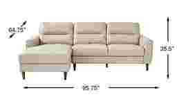 You can search high and low for a living room style as striking as the Sutton Heights sectional, but you'd be depriving yourself of the fantastic amenities in this beautiful piece. Upholstered in top grain leather where the body touches, the left arm facing chaise and right arm facing loveseat offer premium comfort with sumptuously padded seats and tufted cushions. Flare arms hug each end of the sectional with welted seams while top-stitched seams on the seats and backs highlight the piece's elegance. Flush with rich modern appeal, the upholstery's beige color is offset by tapered legs in dark brown finish. Upholstery: Top grain leather where the body touches and polyurethane fabric sides and backs.