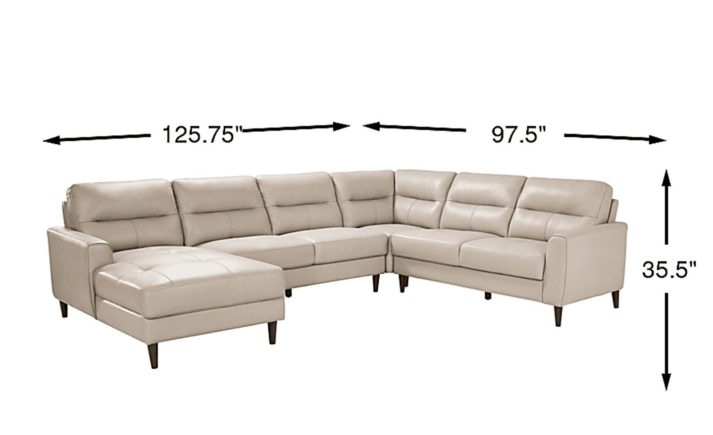 You can search high and low for a living room style as striking as the Sutton Heights sectional, but you'd be depriving yourself of the fantastic amenities in this beautiful piece. Upholstered in top grain leather where the body touches, this piece is flush with rich modern appeal. From the left arm facing chaise all the way to right arm facing loveseat, you'll love the premium comfort supplied by the sumptuously padded seats and tufted cushions. Flare arms hug each end of the sectional with welted seams while top-stitched seams on the seats and backs highlight the piece's elegance. The upholstery's beige color is offset by tapered legs in dark brown finish. Upholstery: Top grain leather where the body touches and polyurethane fabric sides and backs.