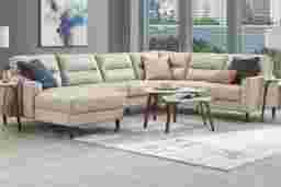 You can search high and low for a living room style as striking as the Sutton Heights sectional, but you'd be depriving yourself of the fantastic amenities in this beautiful piece. Upholstered in top grain leather where the body touches, this piece is flush with rich modern appeal. From the left arm facing chaise all the way to right arm facing loveseat, you'll love the premium comfort supplied by the sumptuously padded seats and tufted cushions. Flare arms hug each end of the sectional with welted seams while top-stitched seams on the seats and backs highlight the piece's elegance. The upholstery's beige color is offset by tapered legs in dark brown finish. Upholstery: Top grain leather where the body touches and polyurethane fabric sides and backs.