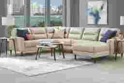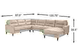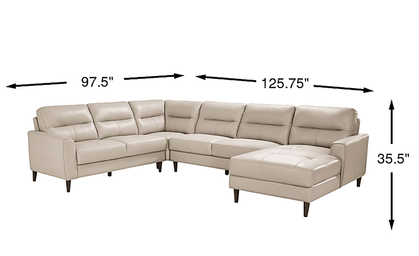 You can search high and low for a living room style as striking as the Sutton Heights sectional, but you'd be depriving yourself of the fantastic amenities in this beautiful piece. Upholstered in top grain leather where the body touches, this piece is flush with rich modern appeal. From the right arm facing chaise all the way to left arm facing loveseat, you'll love the premium comfort supplied by the sumptuously padded seats and tufted cushions. Flare arms hug each end of the sectional with welted seams while top-stitched seams on the seats and backs highlight the piece's elegance. The upholstery's beige color is offset by tapered legs in dark brown finish. Upholstery: Top grain leather where the body touches and polyurethane fabric sides and backs.