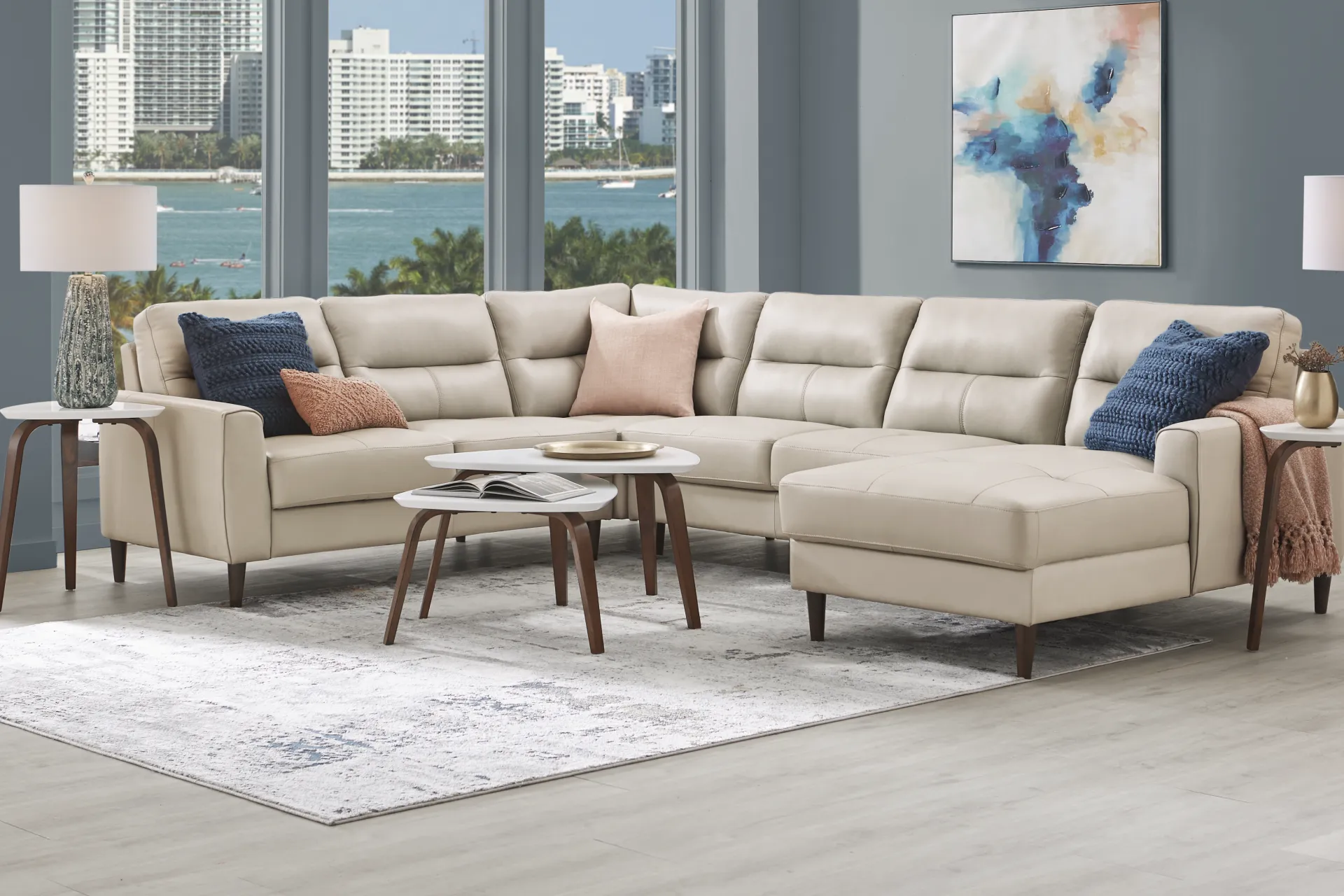 A leather sectional is often an excellent choice for active households because it is naturally more resistant to spills and does not trap pet hair or dander like many fabric alternatives. To maintain the elegant beige upholstery, our experts recommend regular dusting with a soft cloth and applying a high-quality leather conditioner every 6 to 12 months. This simple maintenance routine keeps the leather supple and preserves the protective barrier that helps it stand up to the rigors of daily family life.