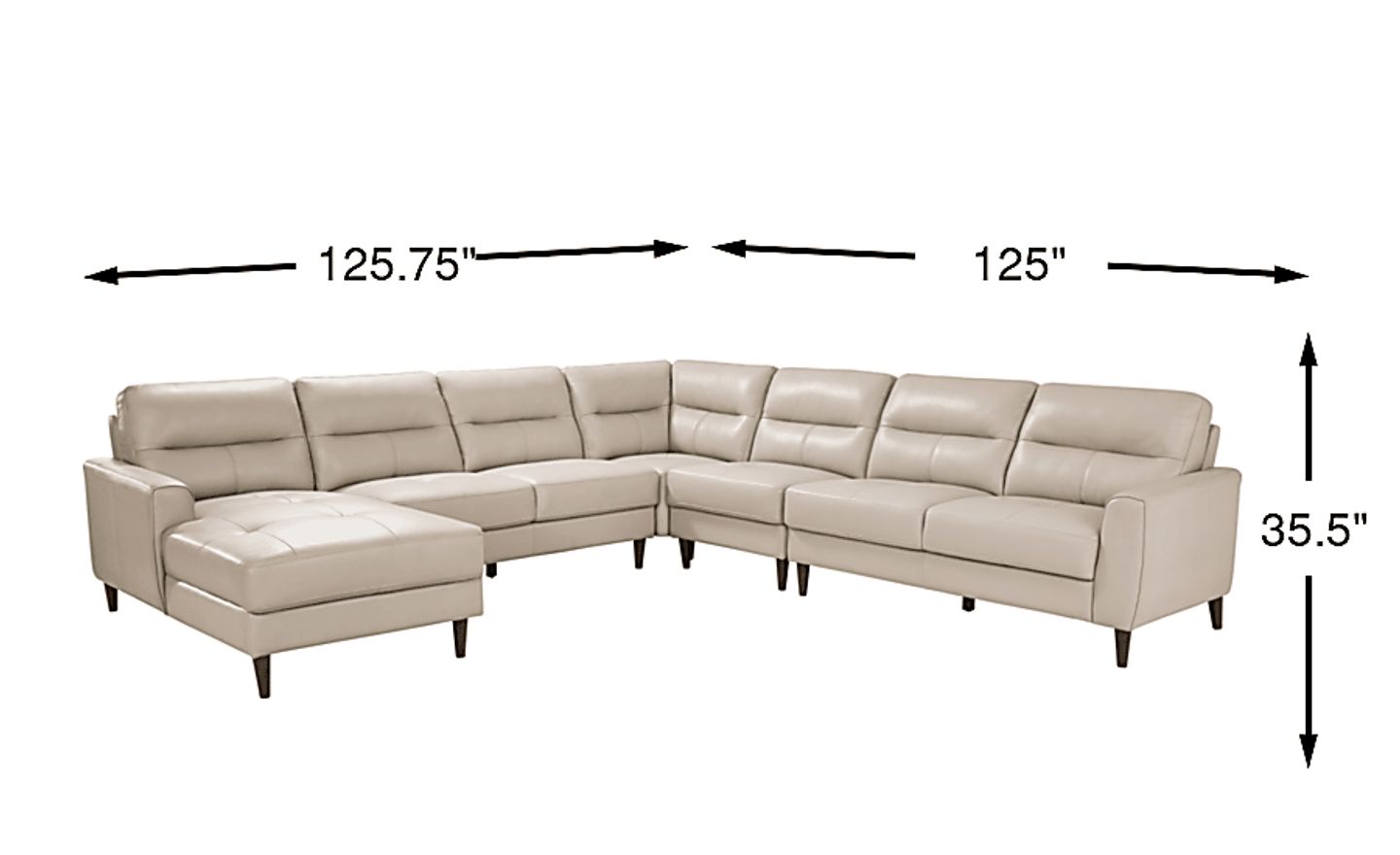 You can search high and low for a living room style as striking as the Sutton Heights sectional, but you'd be depriving yourself of the fantastic amenities in this beautiful piece. Upholstered in top grain leather where the body touches, this piece is flush with rich modern appeal. From the left arm facing chaise all the way to right arm facing loveseat, you'll love the premium comfort supplied by the sumptuously padded seats and tufted cushions. Flare arms hug each end of the sectional with welted seams while top-stitched seams on the seats and backs highlight the piece's elegance. The upholstery's beige color is offset by tapered legs in dark brown finish. Upholstery: Top grain leather where the body touches and polyurethane fabric sides and backs.