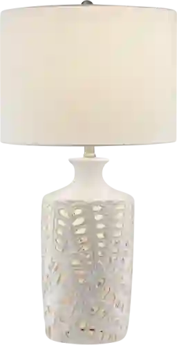 The enchanting ivory white leaf-motif and intricate cutouts offer a modern, artistic take on nature-inspired design. Its neutral cream color and crisp white fabric drum shade allow it to blend seamlessly into contemporary or coastal interiors, adding texture and a touch of timeless elegance without overwhelming your existing color palette.