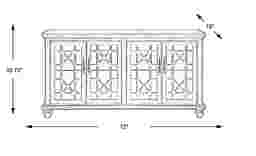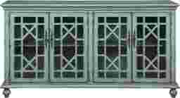 Rustic and stylish, the Swansboro blue accent console is absolutely striking. With a gorgeous textured blue painted finish and made of birch wood and birch veneers, this console makes a polished addition to any room. The four doors have a split in the middle separating the two sides, and are also outfitted with Chinese Chippendale overlay treatment above the glass inserts. Add to that the two ornate antique-style door pulls, and a stunning and polished look is created. This cabinet also has an interior adjustable shelf for added storage.