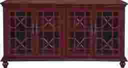 Rustic and stylish, the Swansboro red accent console is absolutely striking. With a gorgeous textured red painted finish and made of birch wood and birch veneers, this console makes a polished addition to any room. The four doors have a split in the middle separating the two sides, and are also outfitted with Chinese Chippendale overlay treatment above the glass inserts. Add to that the two ornate antique-style door pulls, and a stunning and polished look is created. This cabinet also has an interior adjustable shelf for added storage.