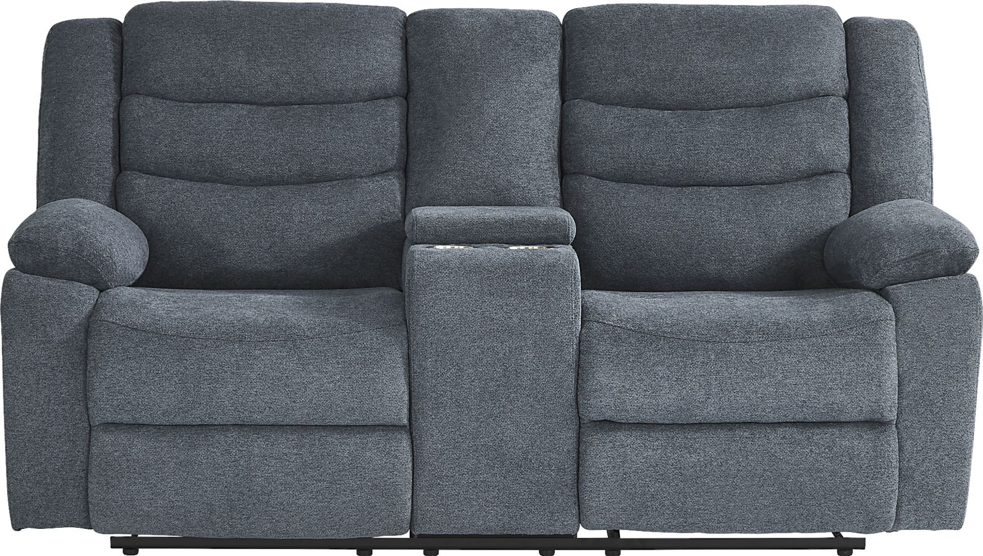 Come for the modern style, stay for the incredible comfort of the Swansea reclining loveseat. Upholstered in blue woven fabric, its plush attached seat and back cushions are complemented by pillow padded arms and padded outside arms and backs so you can luxuriate in periods of extended leisure. Easy-to-use recliner seats on either side put total relaxation at your fingertips, while the convenient cupholder console offers hidden storage for remotes, books and more. Upholstery: 100% Woven Polyester.