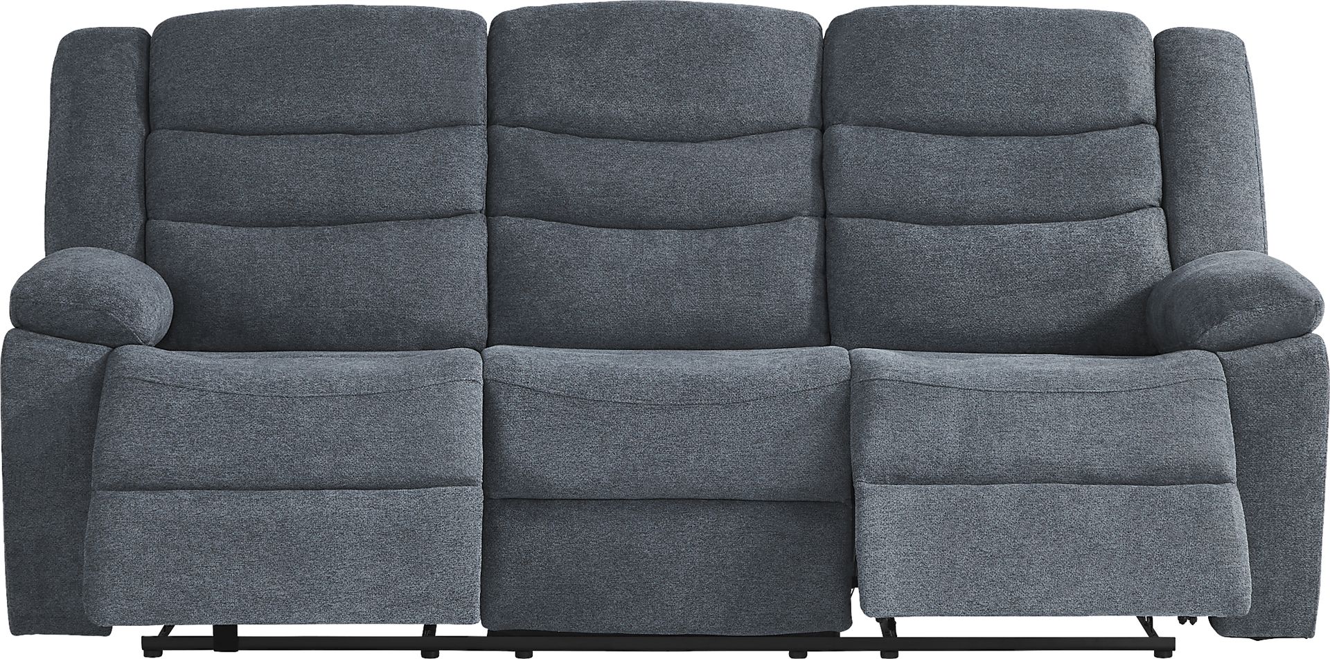 Come for the modern style, stay for the incredible comfort of the Swansea reclining sofa. Upholstered in blue woven fabric, its attached seat and back cushions are complemented by pillow padded arms and padded outside arms and backs so you can luxuriate in periods of extended leisure. Easy-to-use recliner seats on either side put total relaxation at your fingertips. Upholstery: 100% Woven polyester.