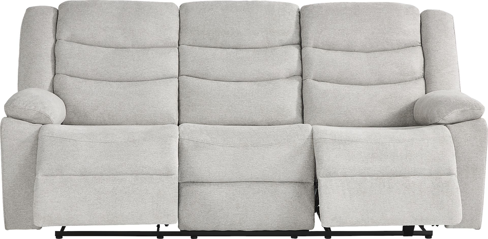 Come for the modern style, stay for the incredible comfort of the Swansea reclining sofa. Upholstered in gray woven fabric, its attached seat and back cushions are complemented by pillow padded arms and padded outside arms and backs so you can luxuriate in periods of extended leisure. Easy-to-use recliner seats on either side put total relaxation at your fingertips. Upholstery: 100% Woven polyester.