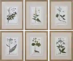 Traditional in style, the Syane set of 6 classic botanical prints bring a timeless elegance to a space. Each print is accented by a textured, linen mat. A distressed wooden frame finished in gold leaf and accented with gold beads completes each piece of artwork. Each print is placed under protective glass.