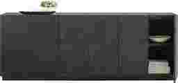 Certain to steal the spotlight with refined grace, the Sylvette collection acts as an effortless statement piece with its sleek silhouette and artful surface. This contemporary black credenza features a clean-lined frame and a sculpted pattern of concentric circles that drift across the doors, adding subtle texture and dimensional interest. Six doors open to generous concealed storage for dining essentials, media components or everyday organization, while the low plinth base keeps the look grounded and modern.
