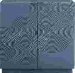 Certain to steal the spotlight with refined grace, the Sylvette collection acts as an effortless statement piece with its sleek silhouette and artful surface. This contemporary navy cabinet features a clean-lined frame and a sculpted pattern of concentric circles that drift across the doors, adding subtle texture and dimensional interest. Two doors open to generous concealed storage for dining essentials, media components or everyday organization, while the low plinth base keeps the look grounded and modern.