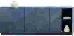 Certain to steal the spotlight with refined grace, the Sylvette collection acts as an effortless statement piece with its sleek silhouette and artful surface. This contemporary navy credenza features a clean-lined frame and a sculpted pattern of concentric circles that drift across the doors, adding subtle texture and dimensional interest. Six doors open to generous concealed storage for dining essentials, media components or everyday organization, while the low plinth base keeps the look grounded and modern.