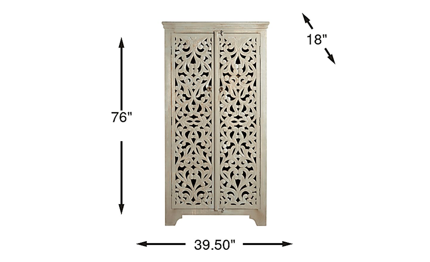 The interconnection of life's moments is reflected in the tight patterns of the Sylvia cabinet as its sweeping lines and curves resolve into a natural order. The tan floral latticework of this traditional accent is punctuated only by two small metal ring pulls, opening to four spacious shelves in warm brown. Adding a functional touch, a discreet pair of stays keep the doors closed when needed.