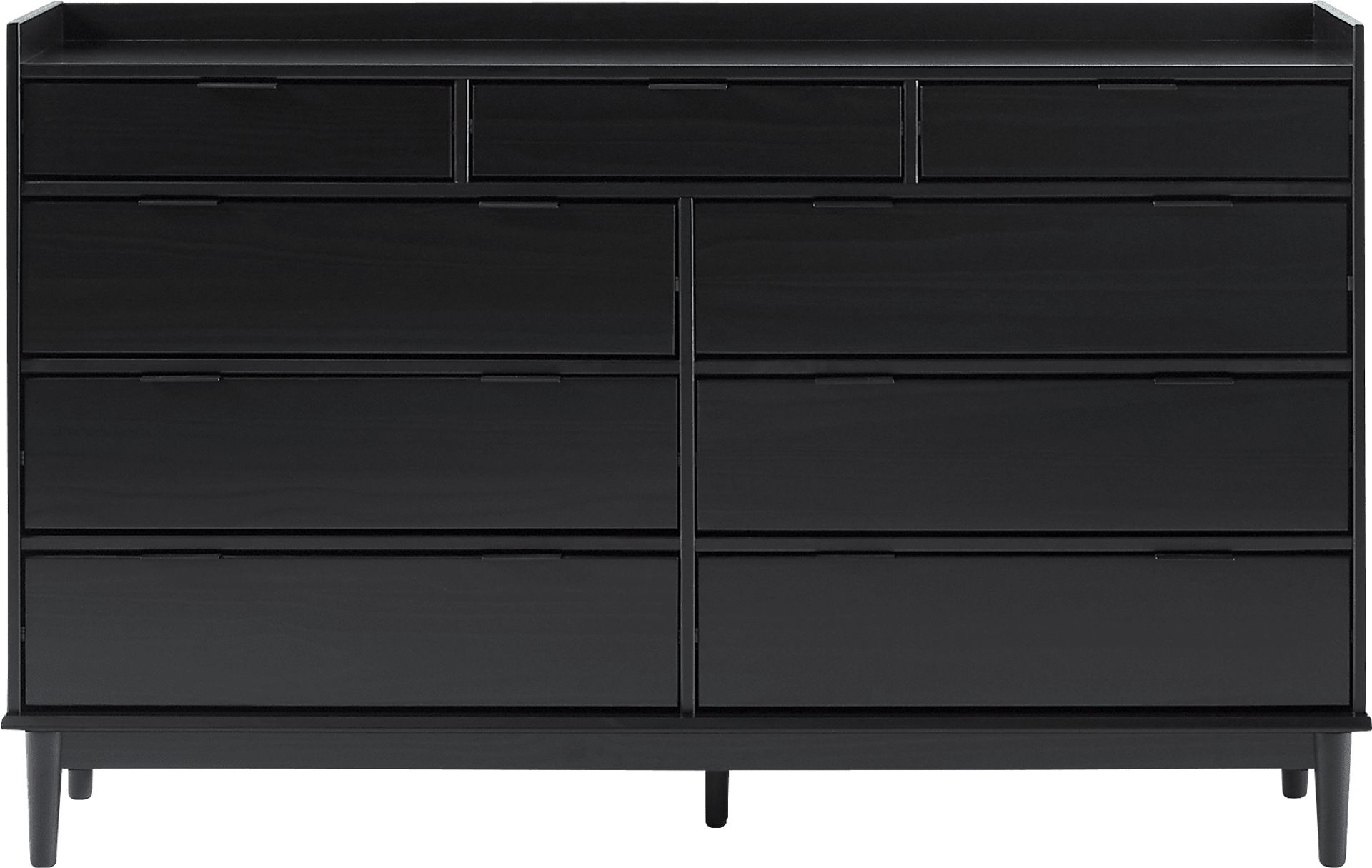 Spacious, sturdy, and sustainably stylish, this Symelo solid wood dresser will effortlessly evoke a sense of classic elegance into your space. Embrace a mid-century modern aesthetic with its gallery top and tapered wood legs, while sleek metal drawer pulls impart a subtle modern motif. Harbor your wardrobe within its four spacious drawers and leave room for socks and other bits and bobs with the two accent drawers on top. This piece pairs perfectly with the matching nightstands for a timeless take on contemporary interiors thats sure to make coming home to your personal sanctuary your favorite part of the day. Customer assembly is required.
