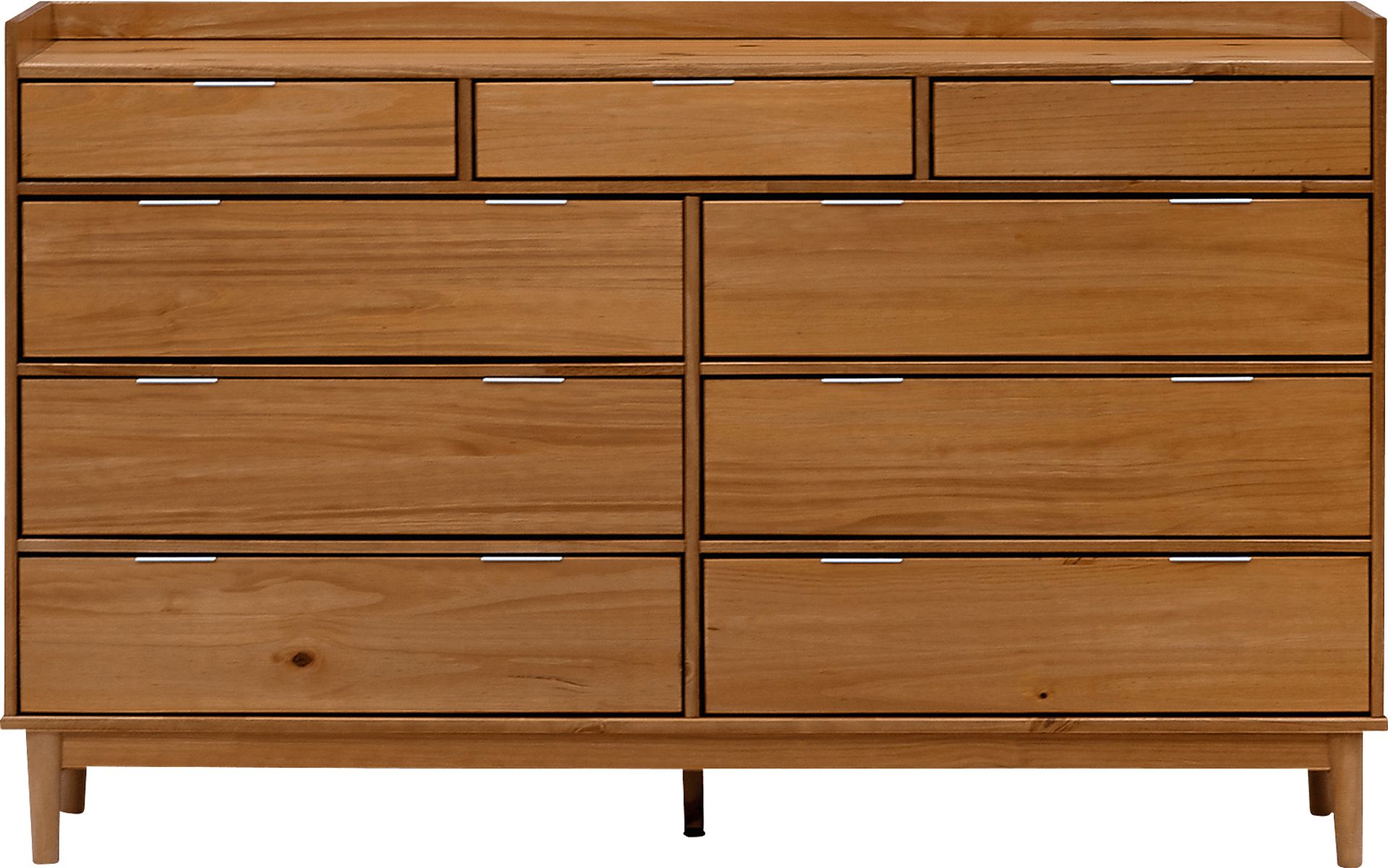 Spacious, sturdy, and sustainably stylish, the solid wood Symelo dresser will effortlessly evoke a sense of classic elegance into your space. Embrace a mid-century modern aesthetic with its gallery top and tapered wood legs, while sleek metal drawer pulls impart a subtle modern motif. Harbor your wardrobe within its four spacious drawers and leave room for socks and other bits and bobs with the two accent drawers on top. This piece is sure to make coming home to your personal sanctuary your favorite part of the day. Customer assembly is required.