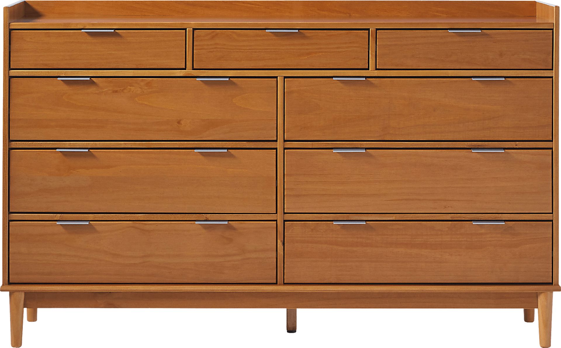 Spacious, sturdy, and sustainably stylish, this Symelo solid wood dresser will effortlessly evoke a sense of classic elegance into your space. Embrace a mid-century modern aesthetic with its gallery top and tapered wood legs, while sleek metal drawer pulls impart a subtle modern motif. Harbor your wardrobe within its four spacious drawers and leave room for socks and other bits and bobs with the two accent drawers on top. This piece pairs perfectly with the matching nightstands for a timeless take on contemporary interiors thats sure to make coming home to your personal sanctuary your favorite part of the day. Customer assembly is required.