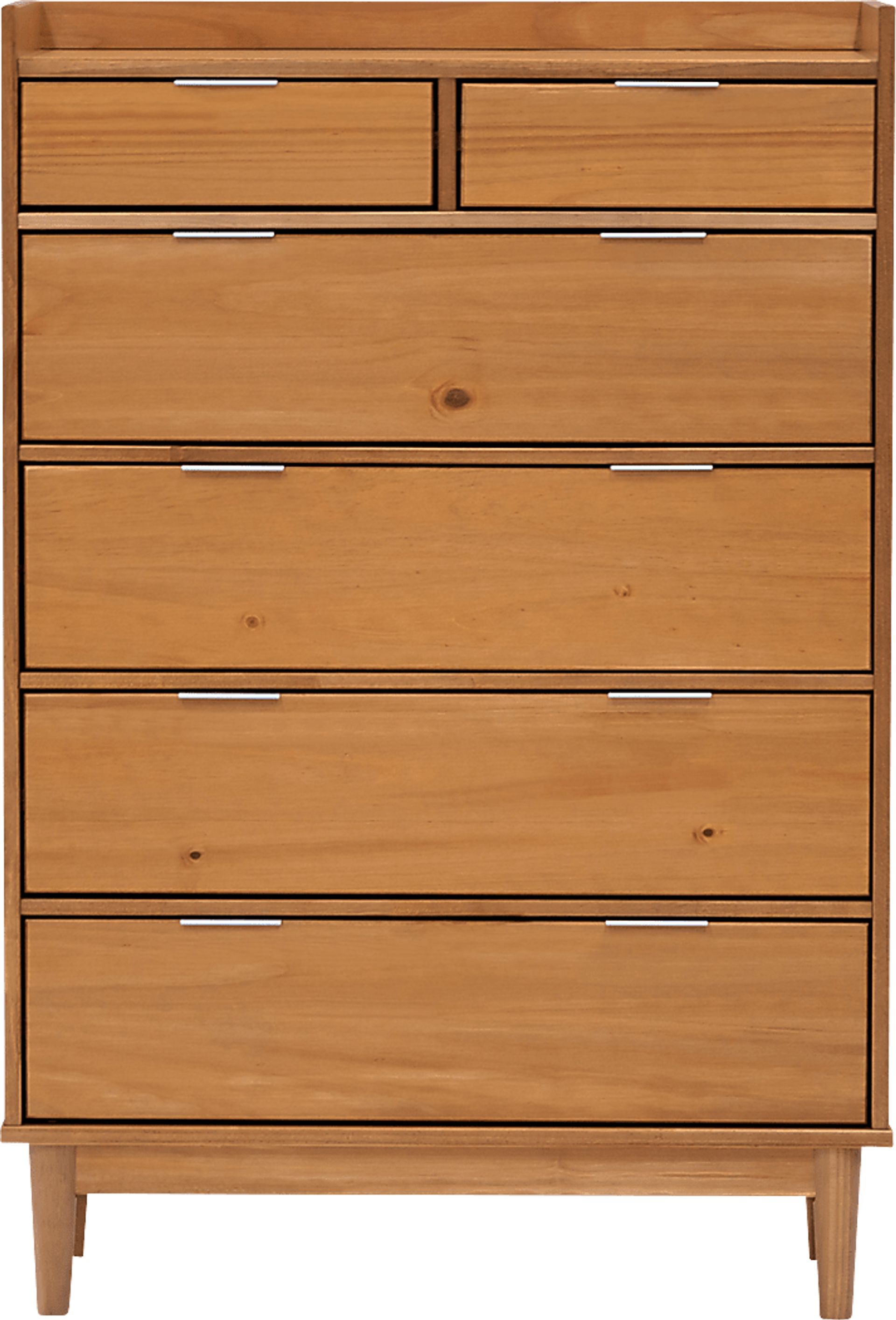 Spacious, sturdy, and sustainably stylish, this solid wood dresser will effortlessly evoke a sense of classic elegance into your space. Embrace a mid-century modern aesthetic with its gallery top and tapered wood legs, while sleek metal drawer pulls impart a subtle modern motif. Harbor your wardrobe within its four spacious drawers and leave room for socks and other bits and bobs with the two accent drawers on top. This piece is sure to make coming home to your personal sanctuary your favorite part of the day. Customer assembly is required.