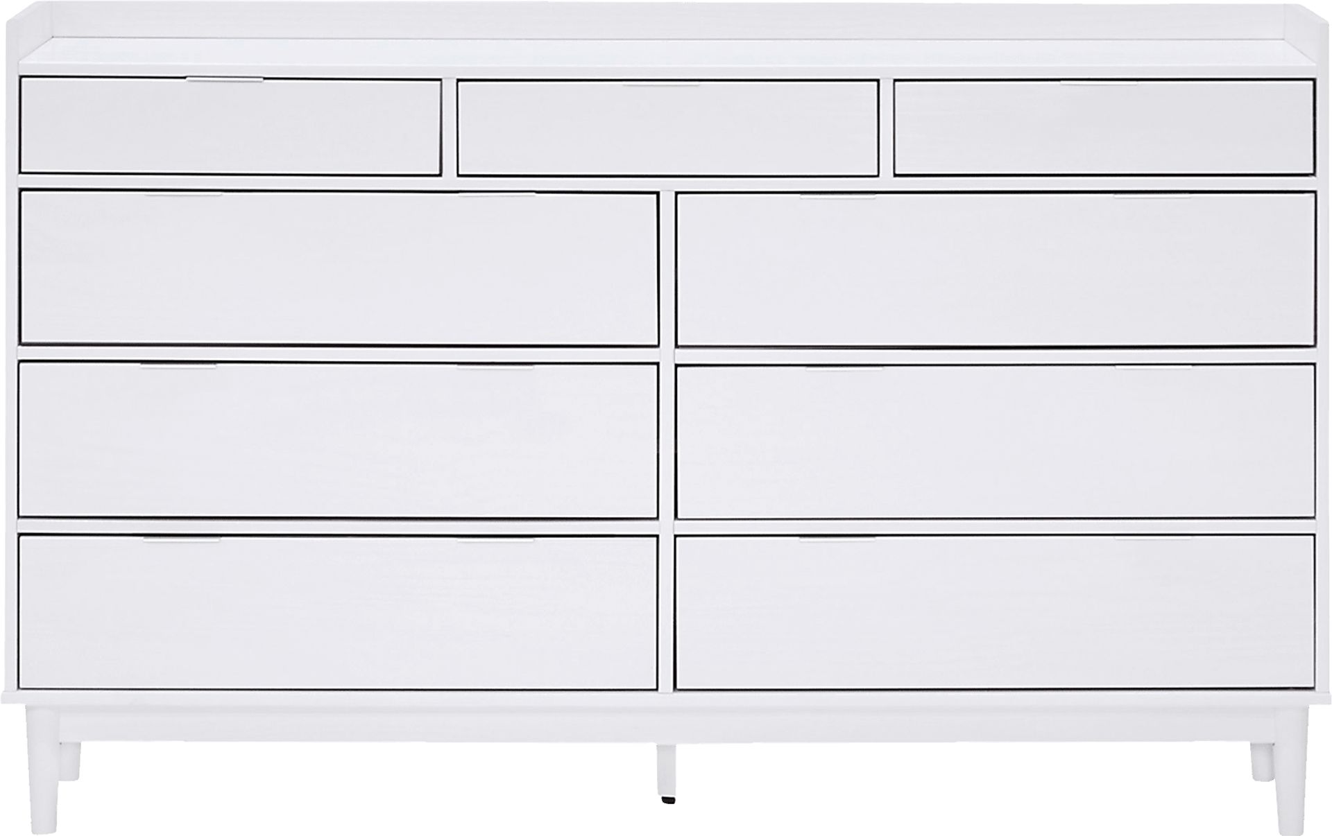 Spacious, sturdy, and sustainably stylish, the solid wood Symelo dresser will effortlessly evoke a sense of classic elegance into your space. Embrace a mid-century modern aesthetic with its gallery top and tapered wood legs, while sleek metal drawer pulls impart a subtle modern motif. Harbor your wardrobe within its four spacious drawers and leave room for socks and other bits and bobs with the two accent drawers on top. This piece is sure to make coming home to your personal sanctuary your favorite part of the day. Customer assembly is required.