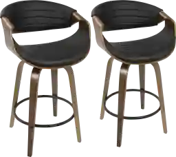 A curvaceous dose of Mid-Century style, the unique design and silhouette of the Symphony Place black counter height swivel stool will look great pulled up to any counter. Upholstered in a sleek black; accented with vertical tufting and walnut colored bent wood legs, it will fit in any room. Comes as a set of 2. Customer assembly is required.