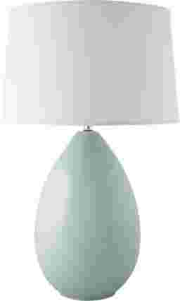 A 29-inch ceramic lamp with a hand-applied finish in soft mist gloss glaze color. It's great for any area of the home. Featuring a soft egg-shaped base that goes great with a casual or contemporary design. The drum shade has a 16-inch top 18 inch bottom and slant of 11 inches. This lamp has a clear cord, soft chrome finish finial, harp and socket with On/Off switch. Made In USA. Takes up to 100-watt bulb (not included) (Lamp is both UL Certified Safety US-CA) for US and Canada.