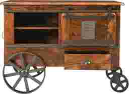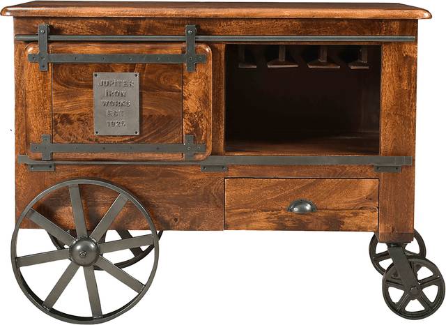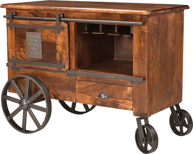 Such a fun addition for your game room, kitchen or den The vintage inspired Tallheim wine cart is finished in a warm brown mango to bring out the natural beauty of the wood, and is perched upon large metal wheels. A sliding door glides back and forth on metal bars, revealing open shelving on one side, and hanging racks for your glassware on the other. A lower drawer is ideal for napkins and openers, while a door on one end provides a place to keep a few extra bottles out of sight Perfect Customer assembly is required.