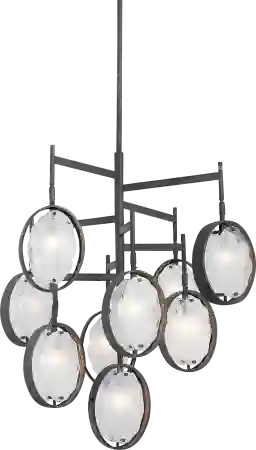 The Taluga Edge chandelier features rings of dark hammered bronze with a subtle golden interior. Inspired from mid-century modern design, each ring holds two handmade artisan inspired clear and white swirl glass ovals. Supplied with 15' wire, 3-12 stems and 1-6 stem for adjustable installation. Professional installation by an electrician is recommended.