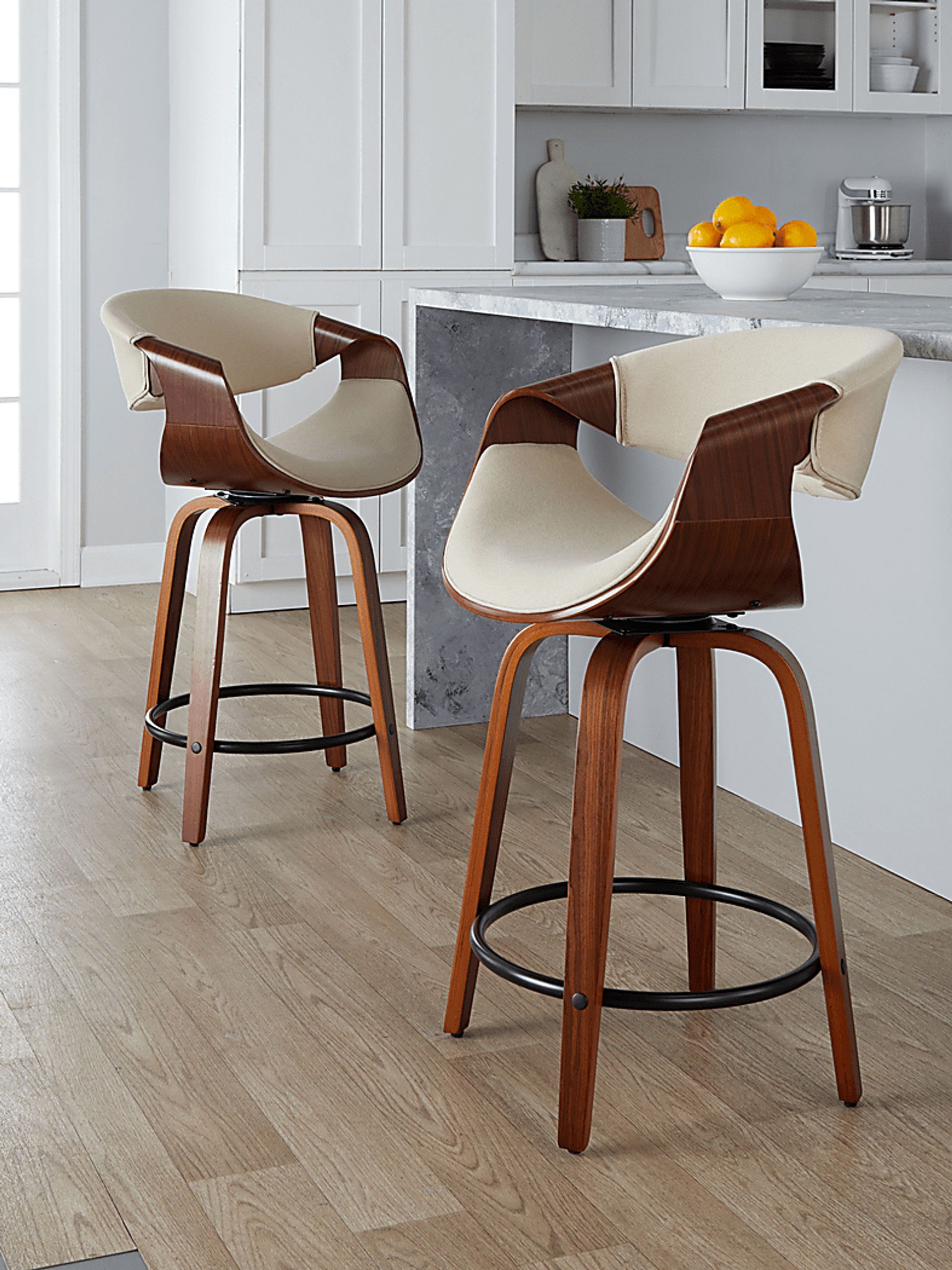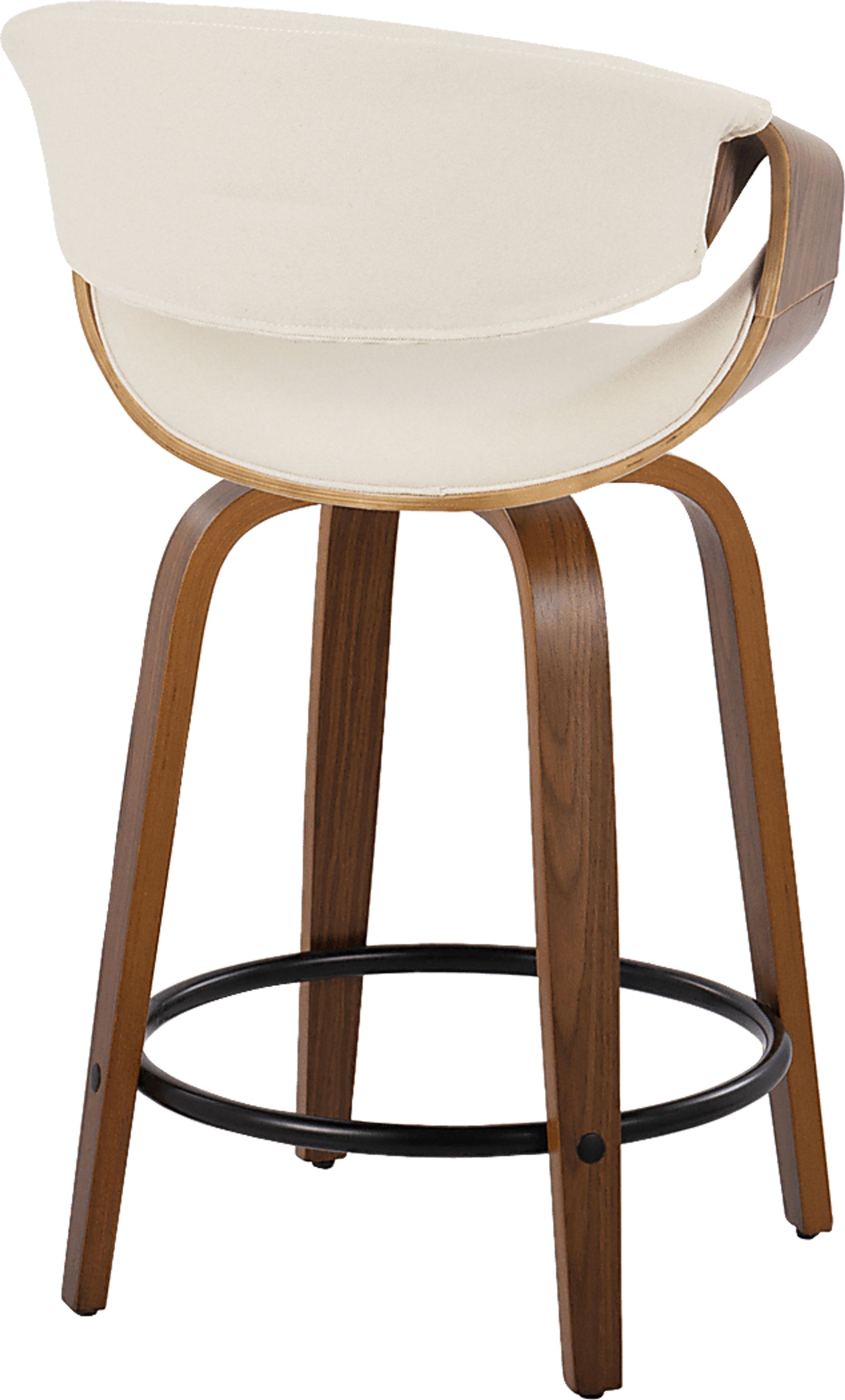 With a curvaceous dose of Mid-Century style, the Tamaaron counter stool will look great at your counter area. Featuring a walnut finished stationary wood frame, luxurious woven fabric upholstery, swiveling seat, and stylish armrests. Customer assembly is required.