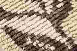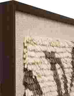 To preserve the texture and color of the wool, we recommend regular light dusting with a soft-bristled brush or a handheld vacuum with a clean upholstery attachment on the lowest suction setting. Avoid using liquid cleaners or spot treatments, as moisture can mat the tufted wool fibers. To prevent the brown and ivory tones from fading, avoid hanging the piece in direct, harsh sunlight for extended periods.