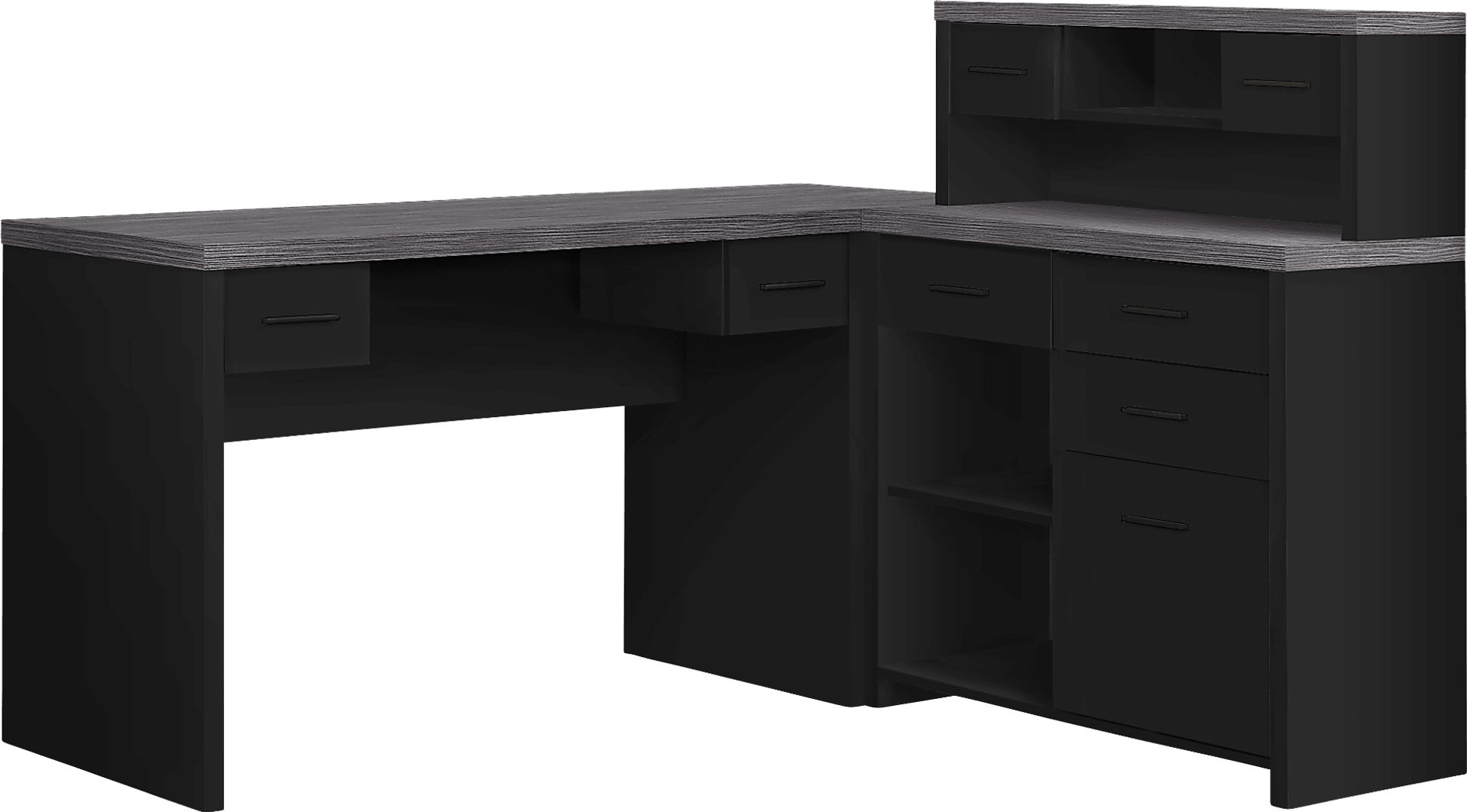 The contemporary appeal of this rich black and gray wood-look Tambec L shaped desk, upgrades your home office with functional storage and work space with style. The spacious desk gives you two work surfaces, which can conveniently be assembled on the left or right hand sides, offers space for a computer or laptop, a place to write, read or to spread out documents. The desk also features an abundance of drawer storage, a hutch and 3 open shelves, including an adjustable bottom shelf keeping all of your essential supplies within easy reach. This is a must-have for any home office. Customer assembly is required.