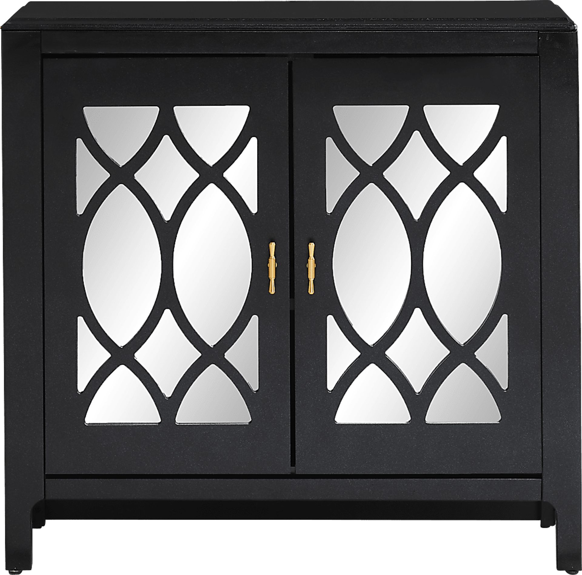With a bold outline balanced against delicate curves, the Tameran accent cabinet radiates refined chic and a playful charm. The crisp lines of this cabinet wrap around two doors inset with mirrors, creating an expansive visual effect. Its rich black finish is complemented by two bright brass pulls on the doors that open to reveal a shelf for storage.