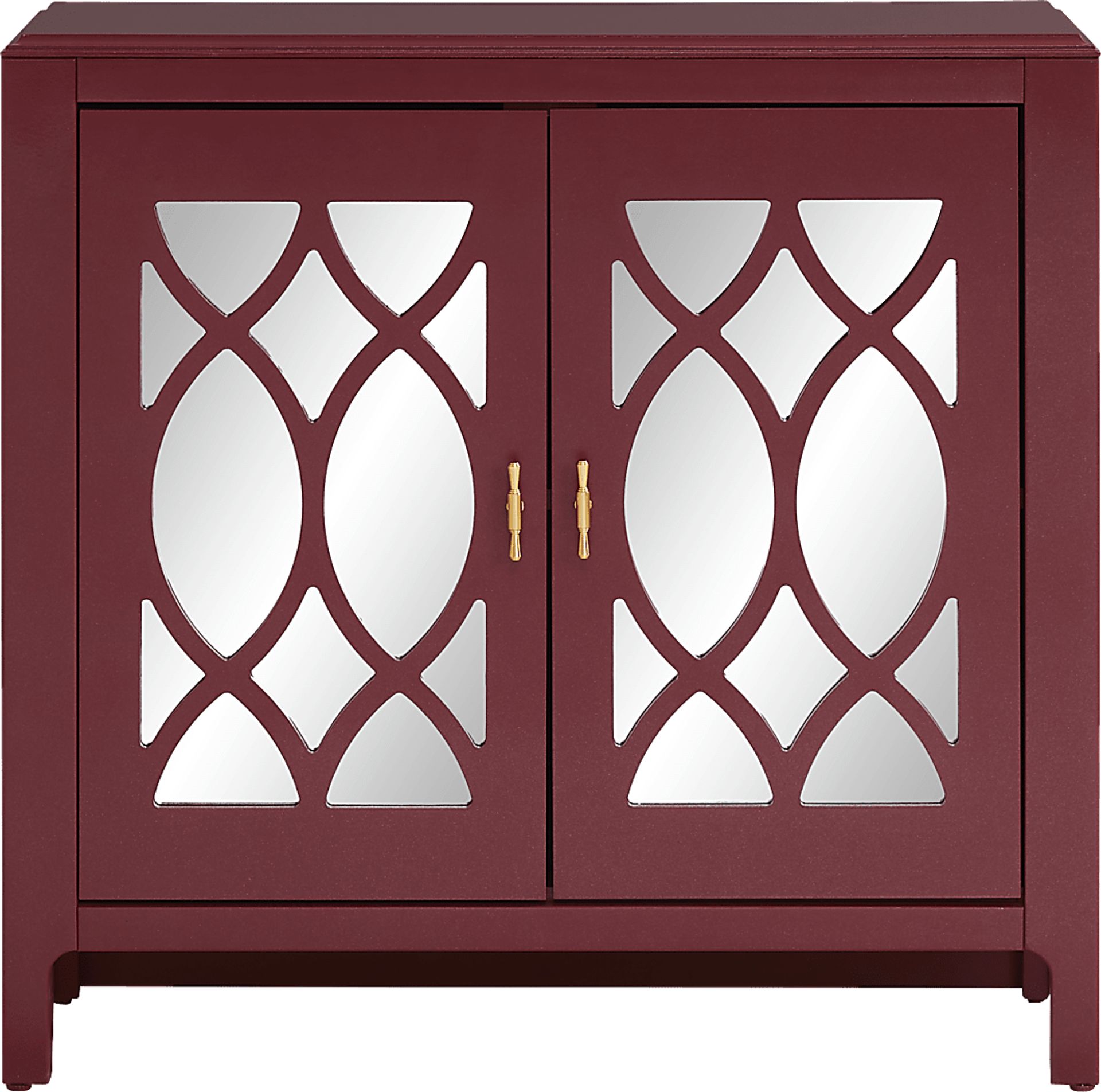 With a bold outline balanced against delicate curves, the Tameran accent cabinet radiates refined chic and a playful charm. The crisp lines of this cabinet wrap around two doors inset with mirrors, creating an expansive visual effect. Its rich red finish is complemented by two bright brass pulls on the doors that open to reveal a shelf for storage.