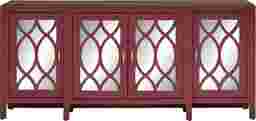 With a bold outline balanced against delicate curves, the Tameran accent cabinet radiates refined chic and a playful charm. The crisp lines of this cabinet wrap around four doors inset with mirrors, creating an expansive visual effect. Its rich red finish is complemented by four bright brass pulls on the doors that open to reveal shelves for storage.
