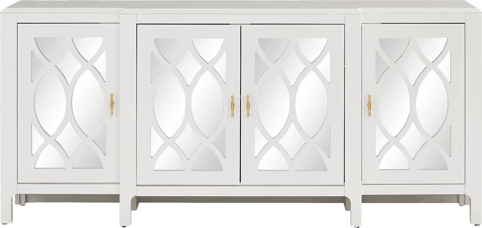 With a bold outline balanced against delicate curves, the Tameran accent cabinet radiates refined chic and a playful charm. The crisp lines of this cabinet wrap around four doors inset with mirrors, creating an expansive visual effect. Its vibrant white finish is complemented by four bright brass pulls on the doors that open to reveal shelves for storage.